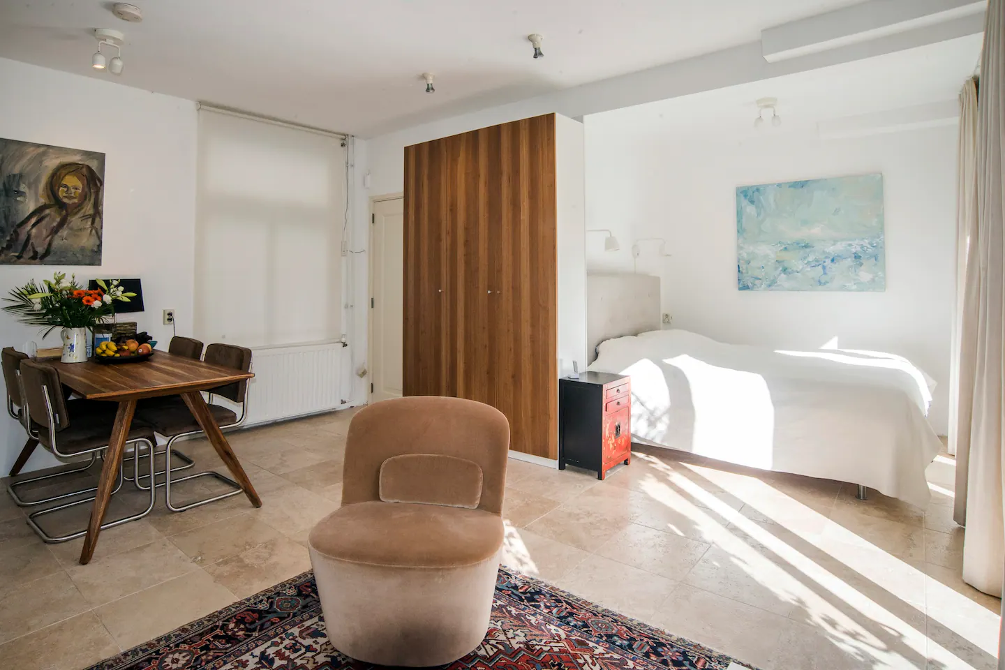 This is a very privat ground floor studioapartment (so no steep stairs) with your own privatgarden , in the peaceful so called backhouse of our canalhouse at the Amstel river. extremely central yet very quiet. A privat marble bathroom/ toillet, privat kitchen+ privat (Miele) washingmachine / dryer(etc.).2 minutes away from Central Station( subway), 9 minutes from World Trade center(subway). The subway entrance is 2 minutes