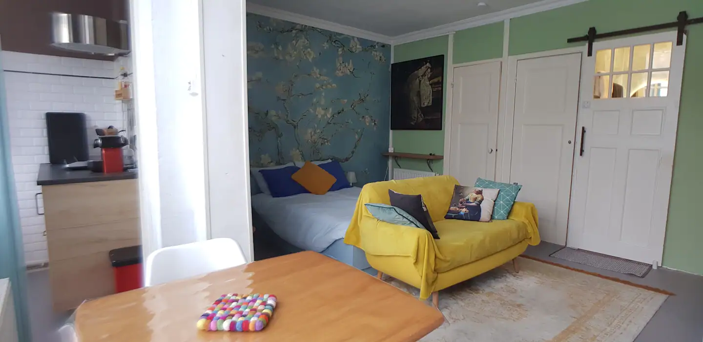 The independant studio flat is is on the 2nd floor (you have to climb 2 STAIRS !) of an early 20th century apartment building. It’s fitted with a double bed (140x200cm), comfortable sofa (non-convertible) and a dining table for 2 people.